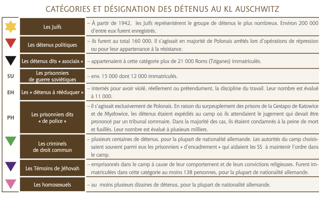 Ce tableau met en évidence les différents groupes persécutés et discriminés dans le camp de concentration.