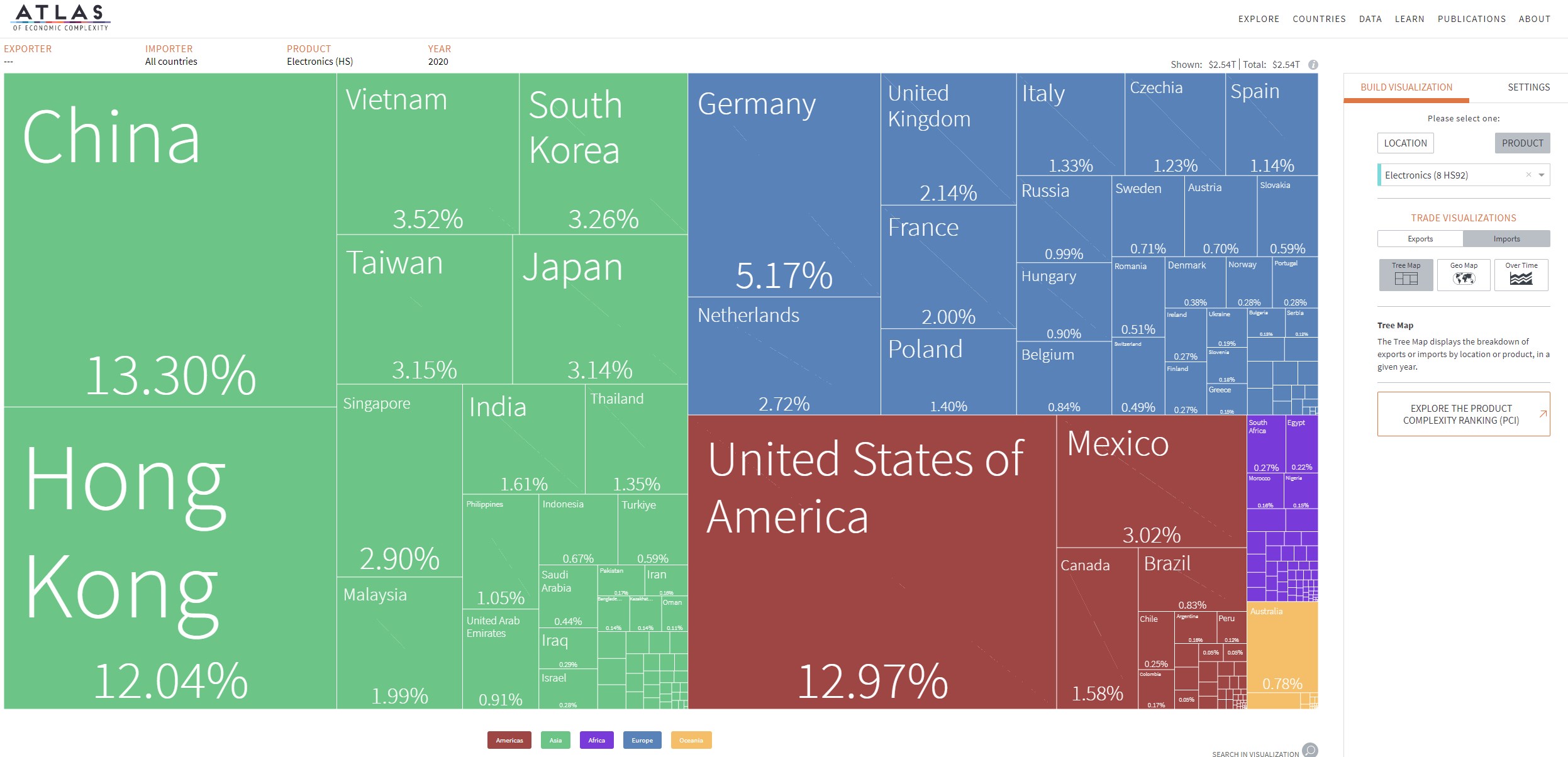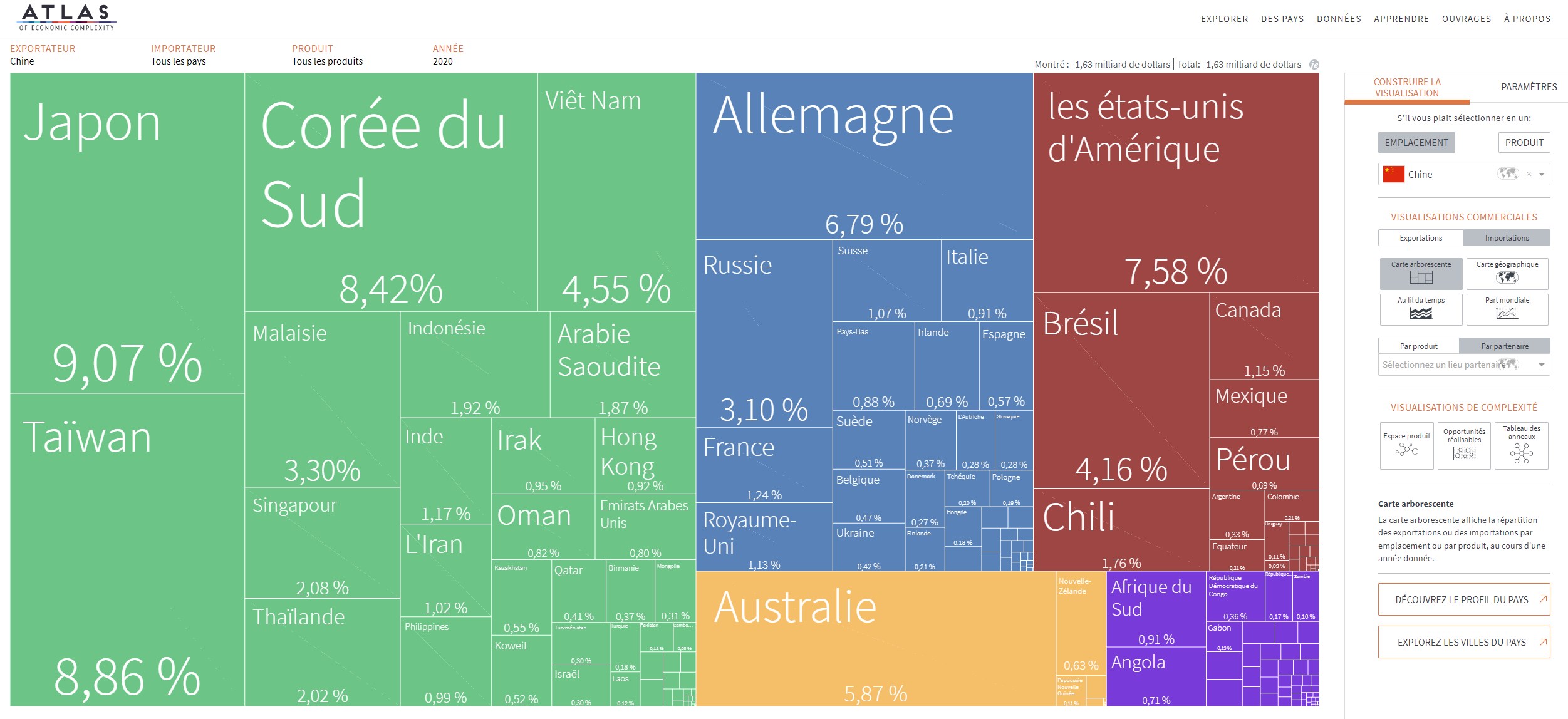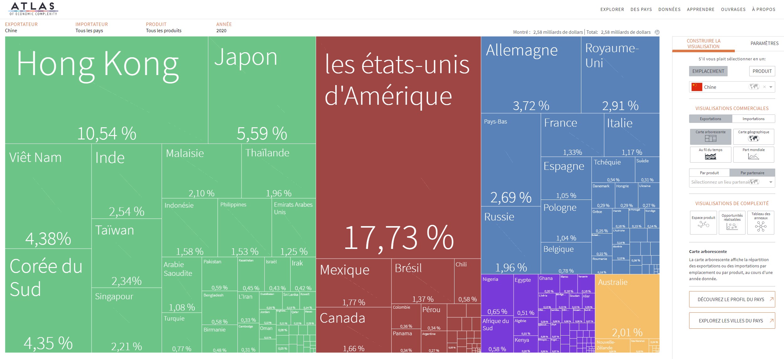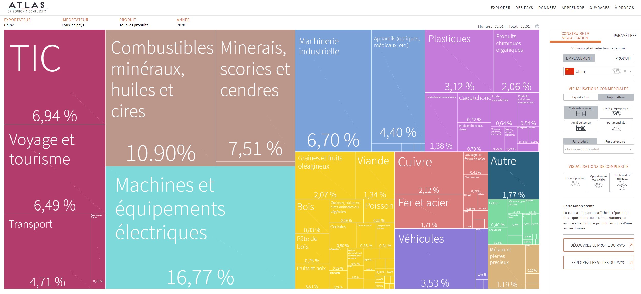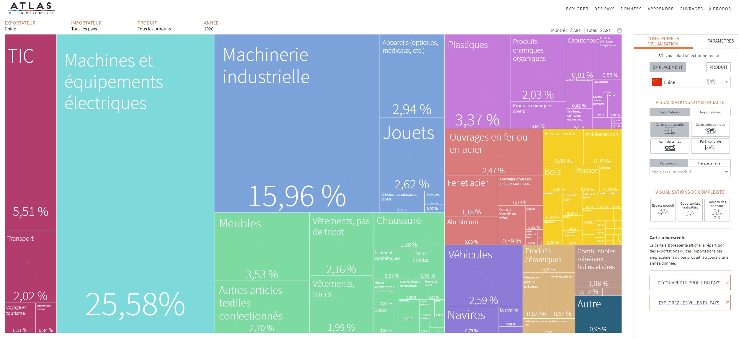 L’Atlas de la complexité économique est un outil de visualisation de données primé qui permet d’explorer les flux commerciaux mondiaux entre les marchés, de suivre cette dynamique dans le temps et de découvrir de nouvelles opportunités de croissance pour chaque pays. Construit à la Harvard Kennedy School of Government, l’Atlas est alimenté par les recherches du Growth Lab de Harvard et constitue l’outil phare de The Viz Hub, le portefeuille d’outils de visualisation du Growth Lab.